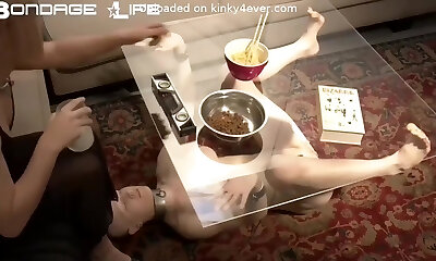 Bound obese submissive in latex