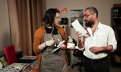 Platinum-blonde secretary in glasses Kamila and her colleague please their manager
