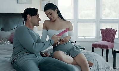 Petite brunette cheerleader Daisy Haze plays in her pussy with her vibrator until she finishes off