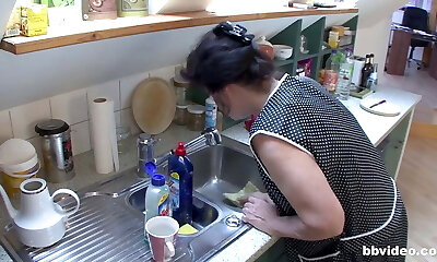 Randy blonde milf with massive mammories got fucked from the back while in the kitchen